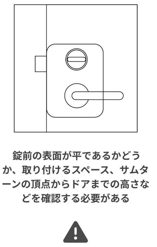 ドア形状が合わない | サムターンが回転式でない/ドア枠が狭い | ✅ 公式サイトの「対応サムターン一覧」を確認 ✅ ドア厚み・ラッチ位置を購入前に計測 |